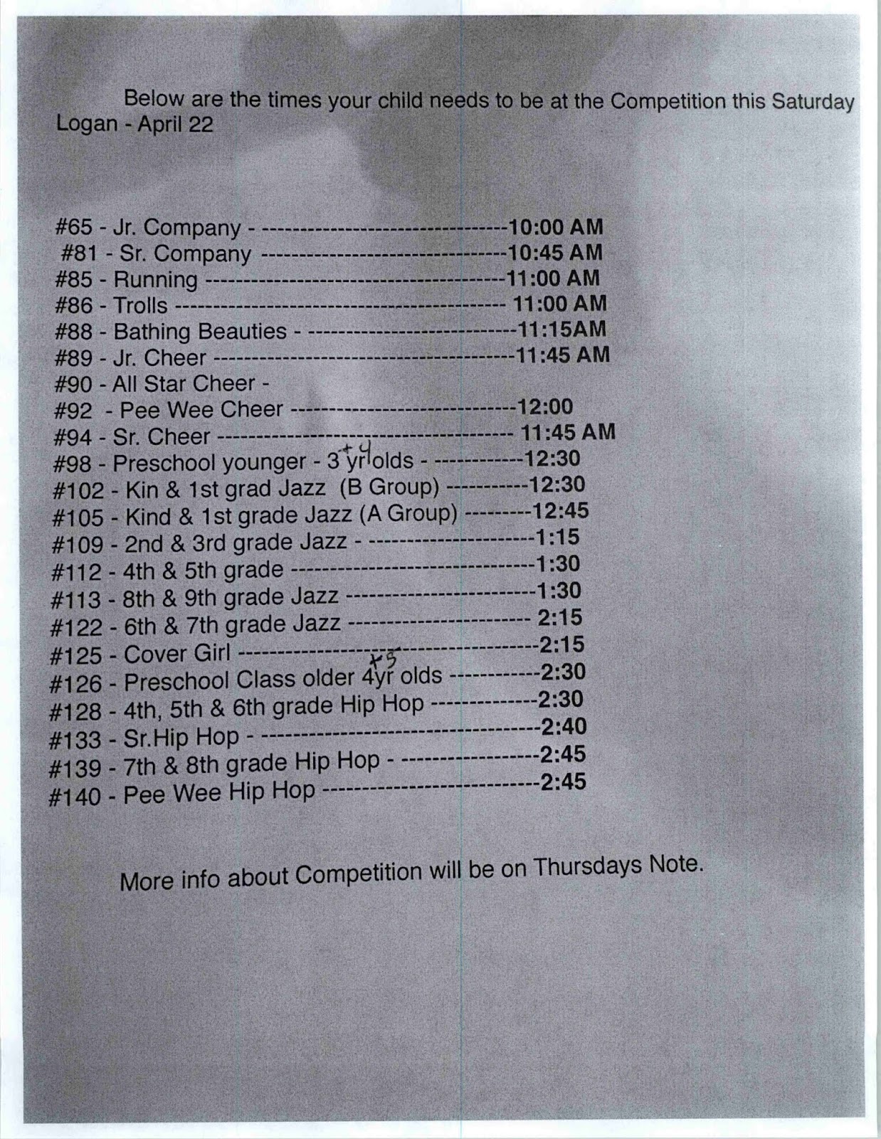 This weeks schedule will vary a little bit due to Spring Break. We are tried to get most of the classes covered on Monday-Wednesday so that we could get everybody there before people leave on vacations. Thank you for your continued support. We are so excited for our next competition April 22nd!!